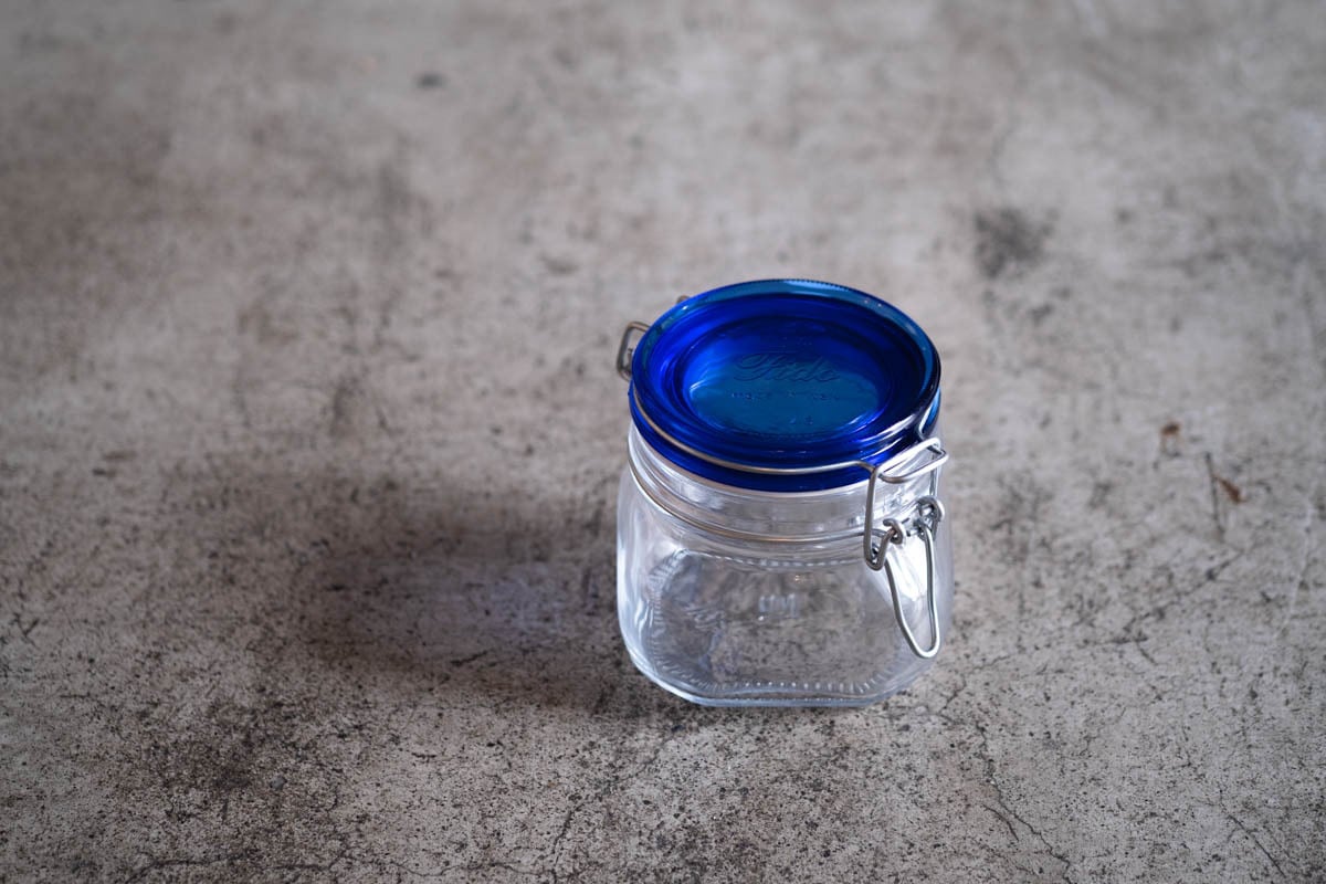 鮮やかなブルーの蓋が目を引く、イタリアの老舗ガラスメーカー"Bormioli Rocco(ボルミオリ・ロッコ)社"のガラス保存容器です。