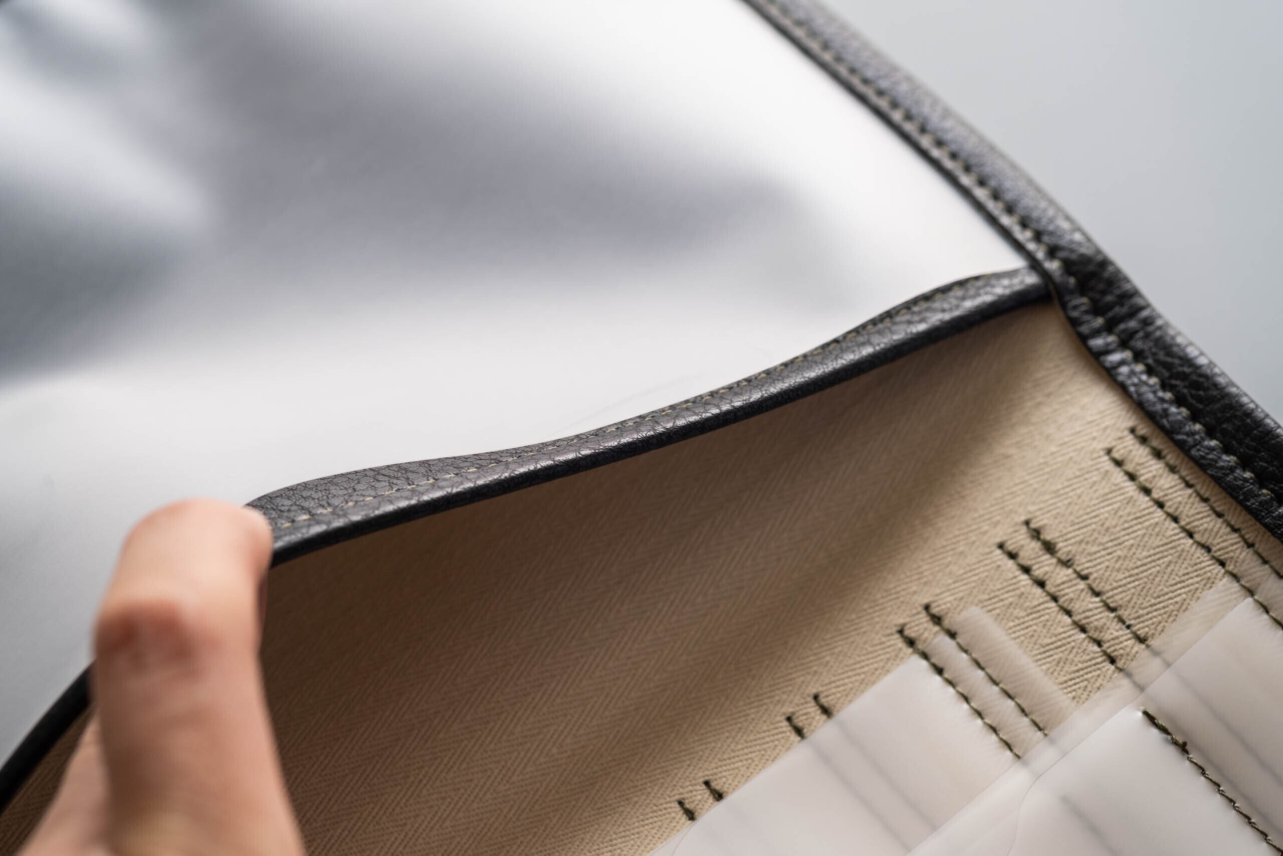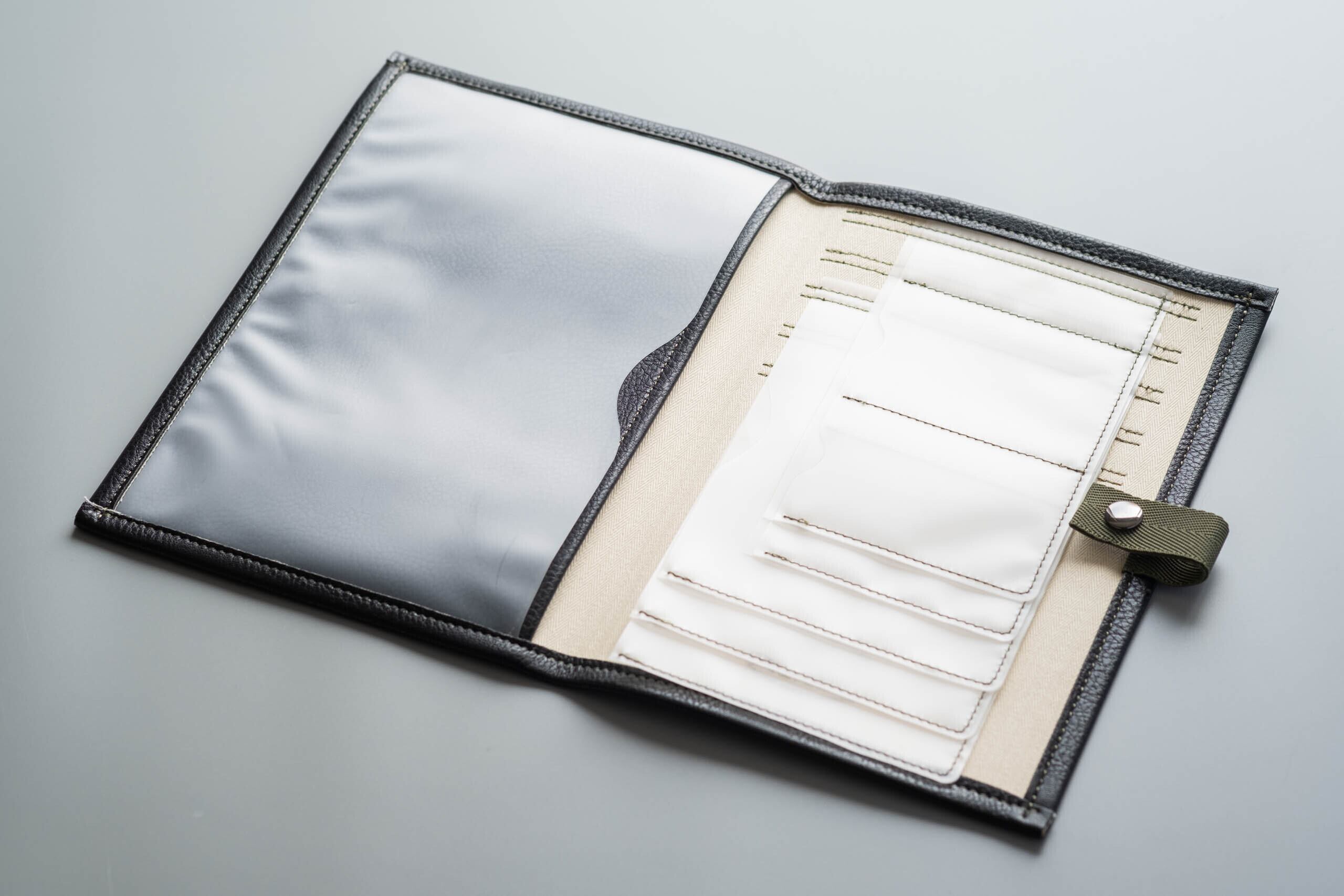 表皮は本革ではなくビニールレザーですが、高級感がある車検書入れです。スナップもゆるめで色々挟めるようにしてあります。