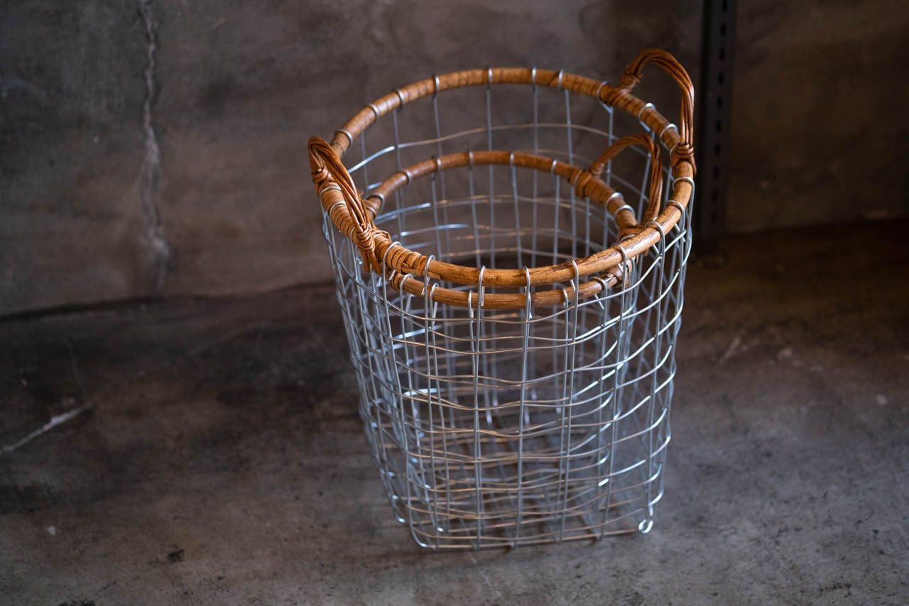 ラタンの持ち手がアクセントになる、ワイヤーバスケットです。