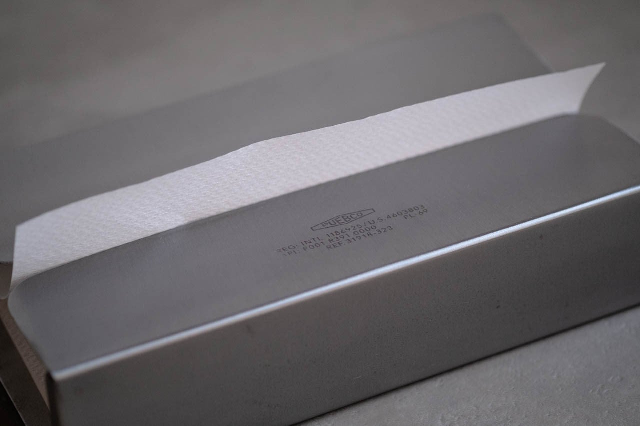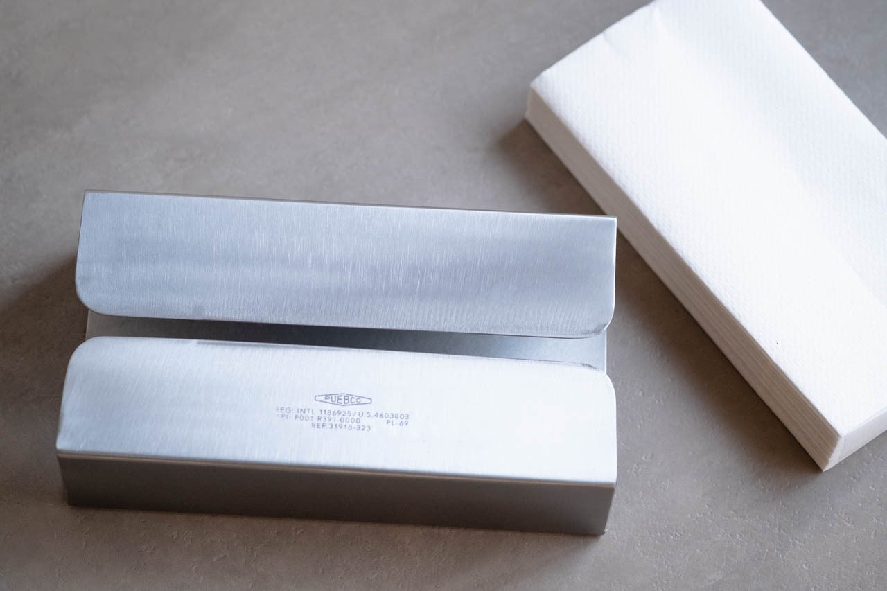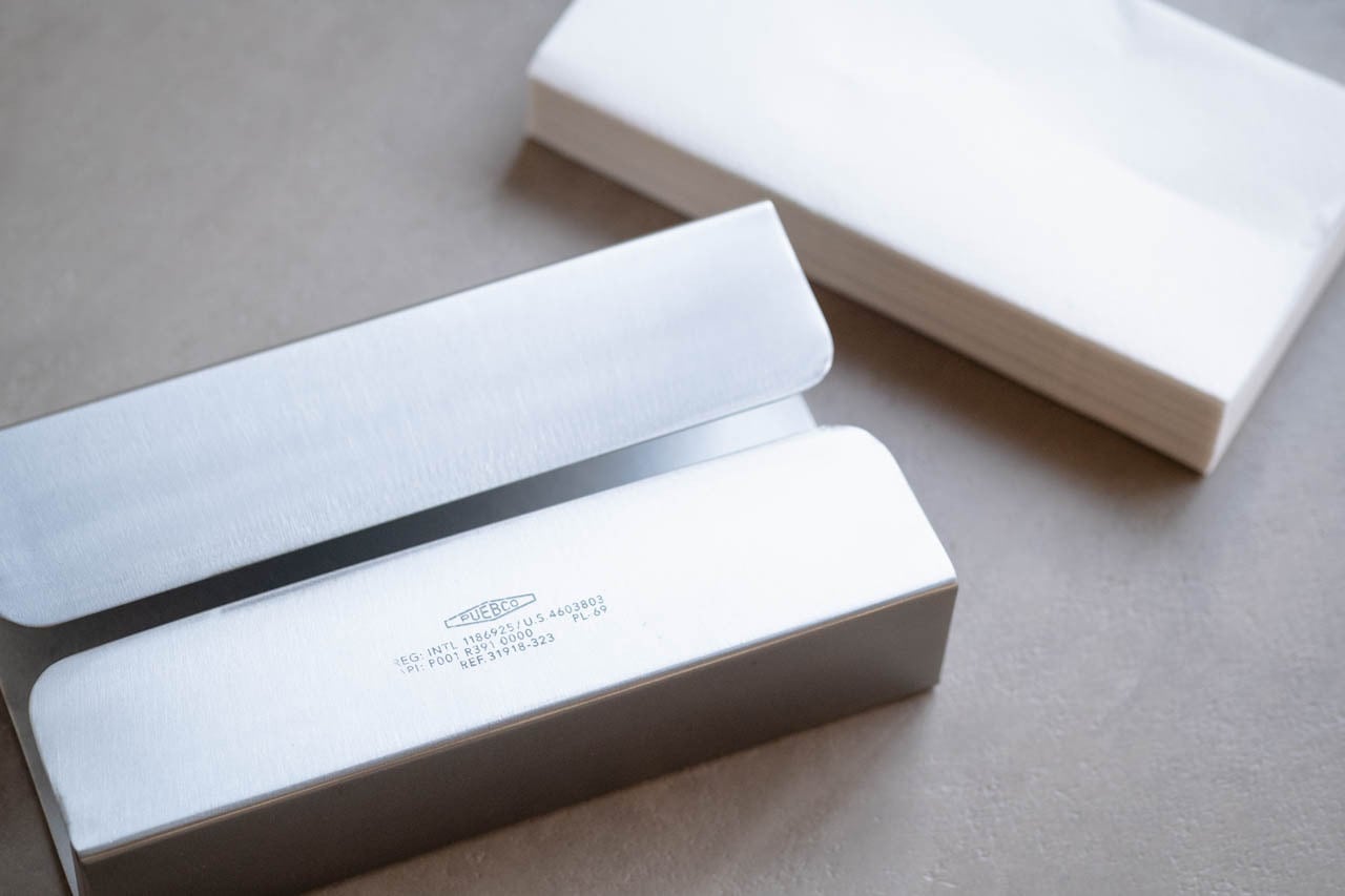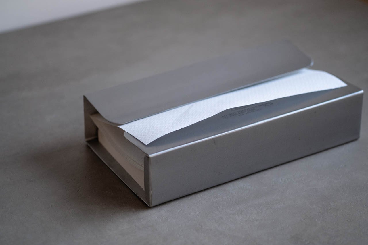 無駄な装飾がないシンプルなデザインで、スチールの質感が工業的でカッコ良いペーパーディスペンサーです。キッチンペーパーや箱ではない袋のティッシュペーパーなどがお使いいただけます。