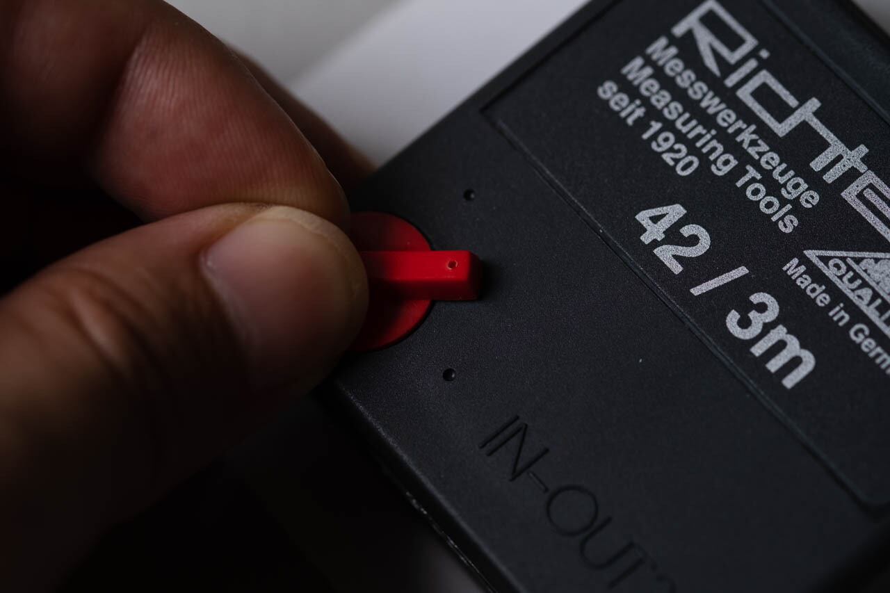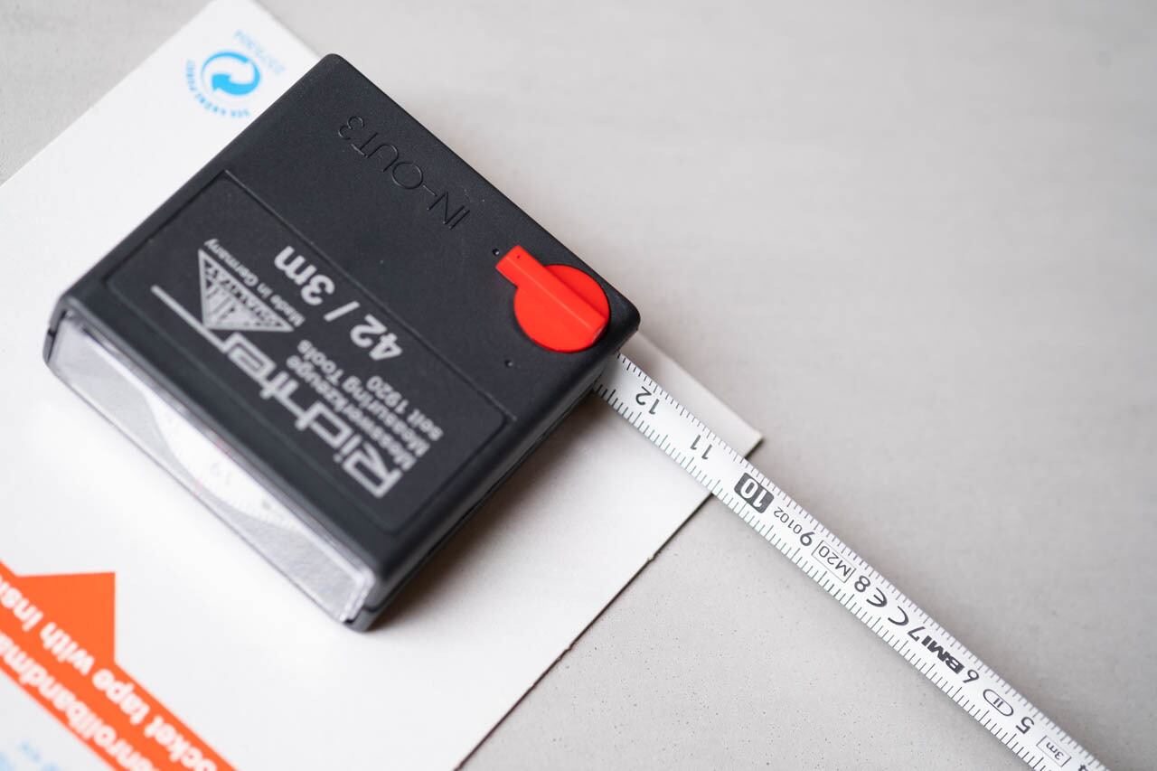 No.42のメジャーは、本体上部の透明プラスチック窓から目盛りを見ることが可能で、本体のサイズを含めた長さを計ることができます。
