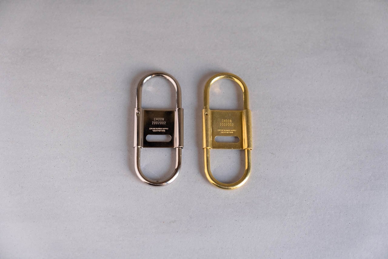 カラビナタイプのキーリングをCANDYなりにデザインするとこういう感じになりました。スプリング式で脱着しやすく、開閉式のセンターパーツがストッパーになっているのでベルトループに付けた際にキーリングと鍵の回転を防ぎます。