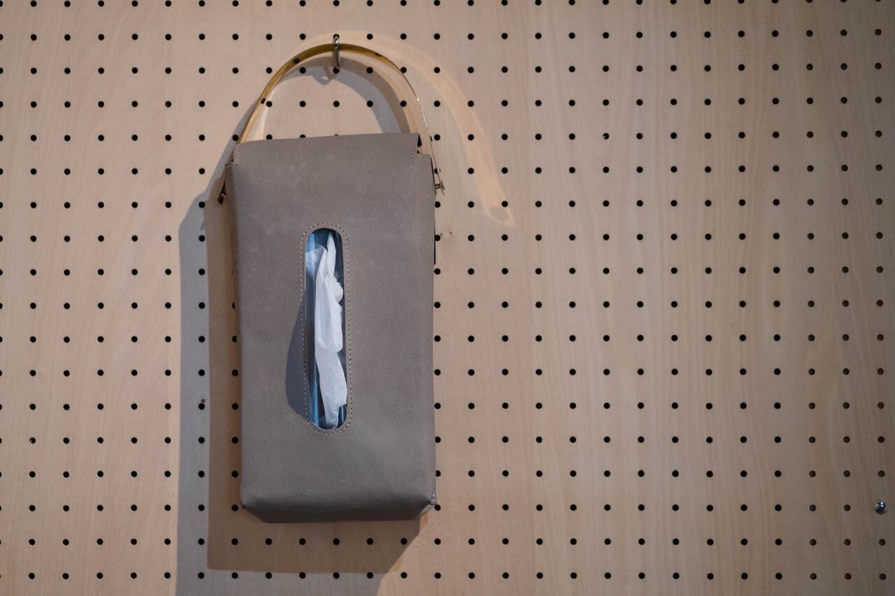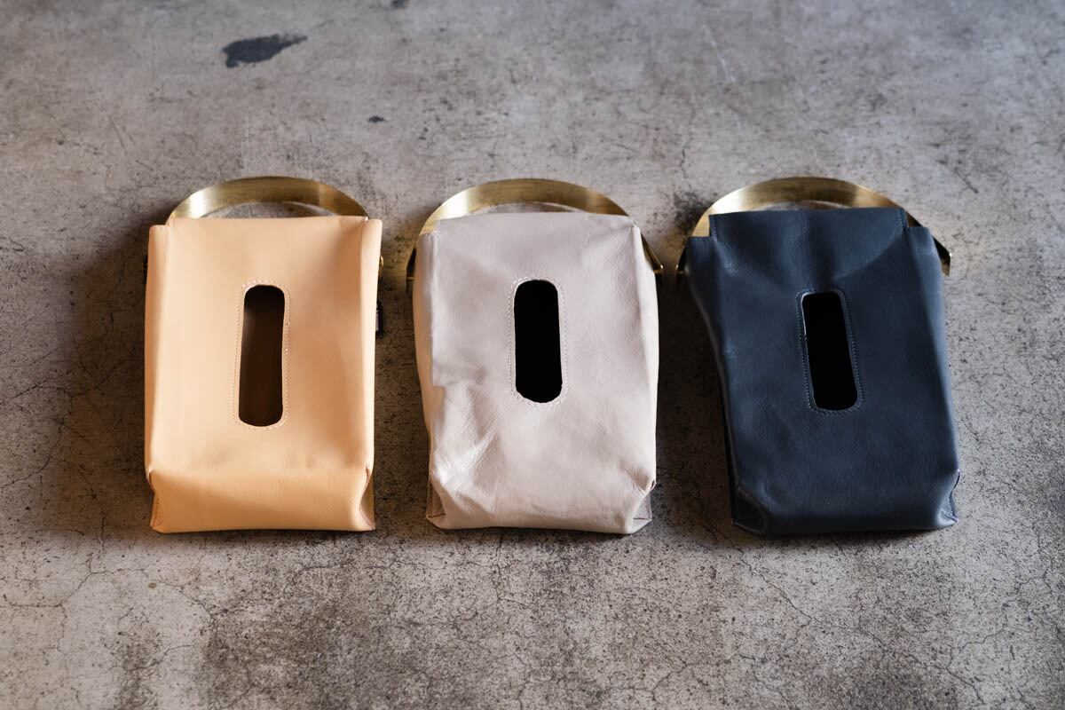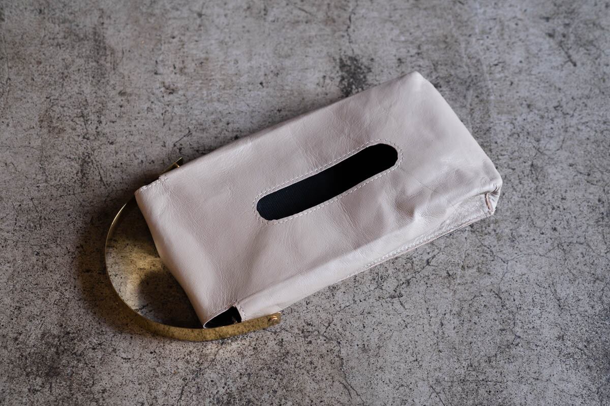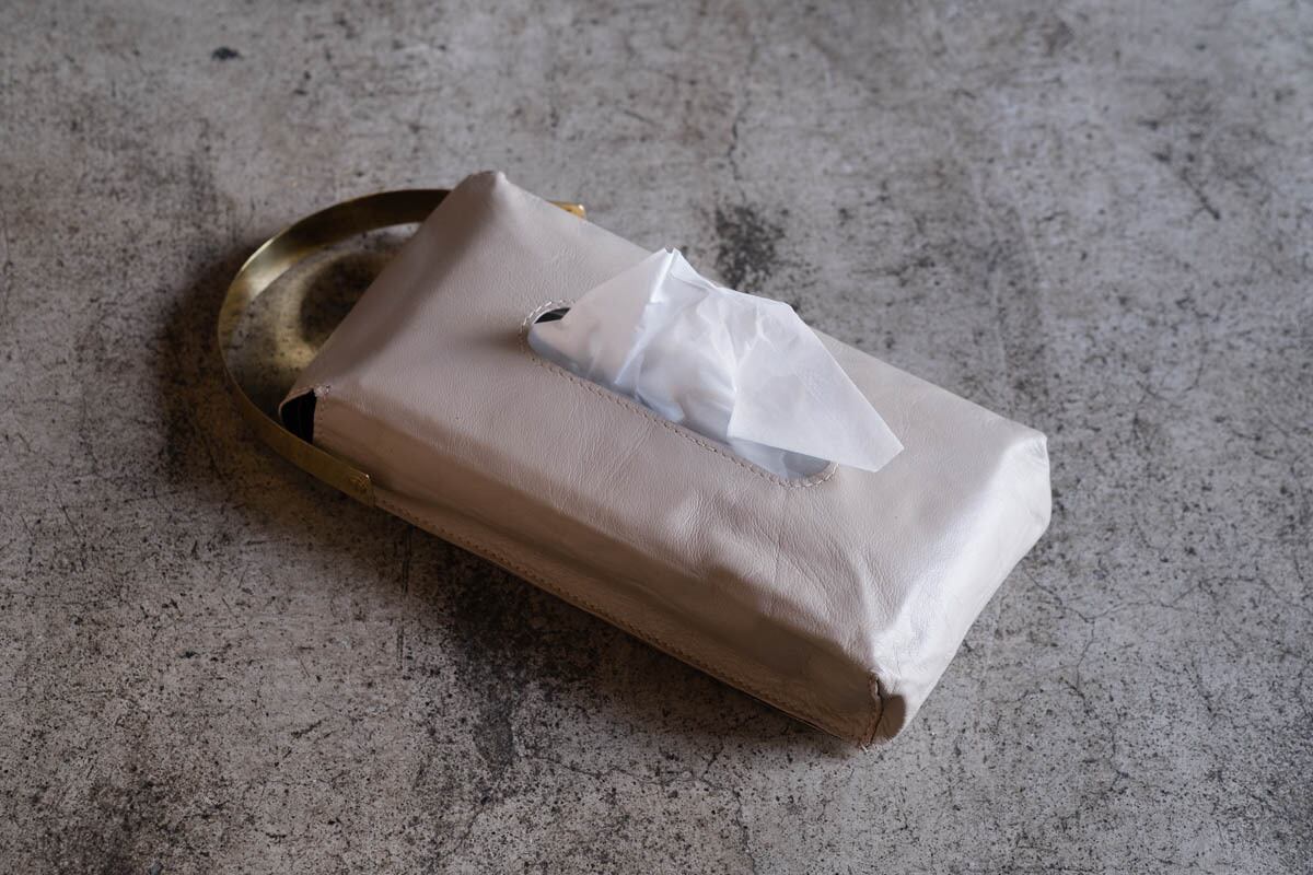 山羊の革で作ったティッシュケースに真鍮の持ち手をつけたアイテムです。