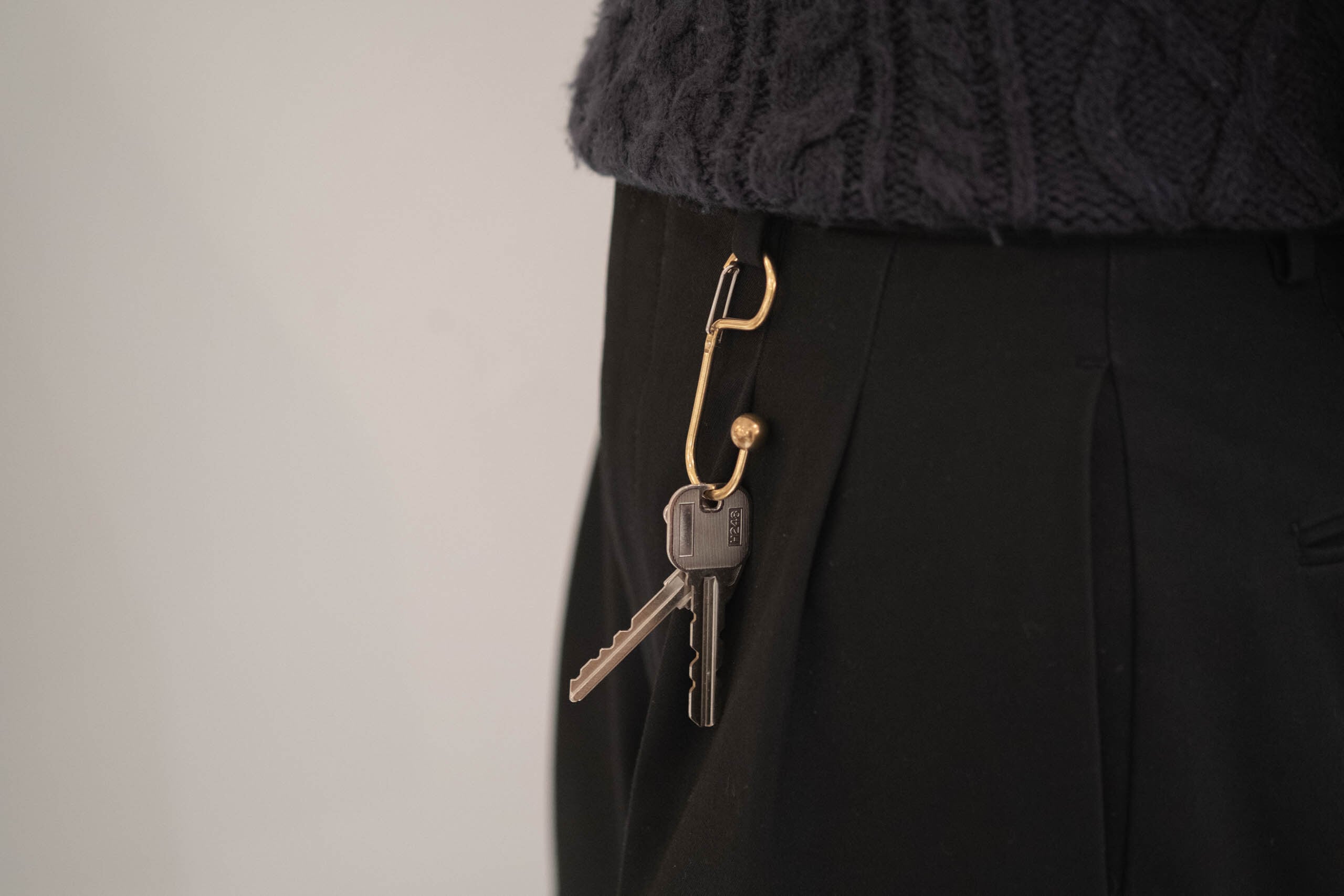 ベルトループやバッグなどに簡単に着脱できるカラビナとキーリングのいいとこ取りしたようなデザインです。先端についた丸い玉を回す事で鍵を取り付けることができます。